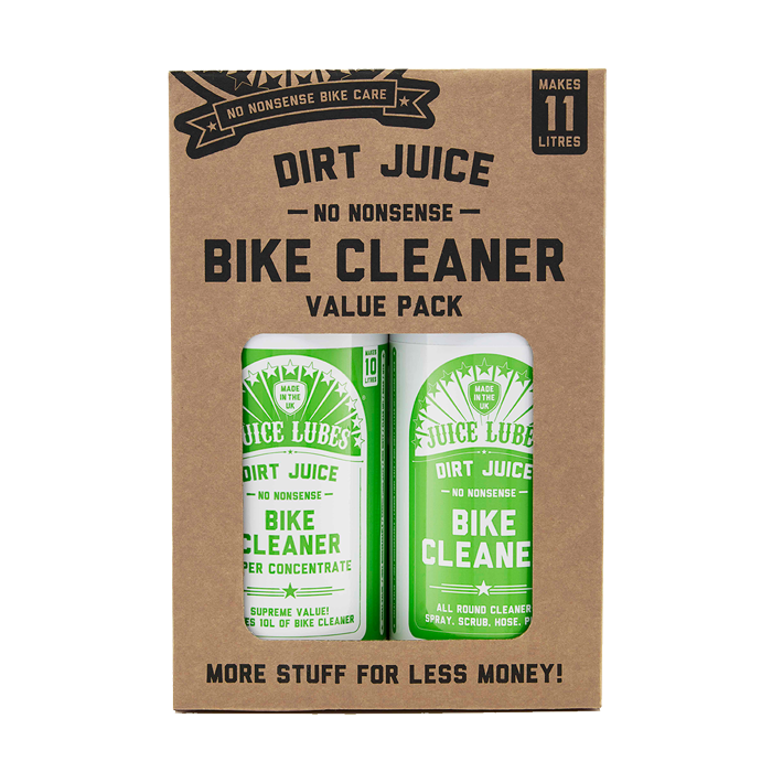 The Double Pack contains 1 x 1 Litre of concentrated Dirt Juice Super Gnarl and 1 x 1 Litre of Dirt Juice Less Gnarl ready to use bike wash with trigger spray.