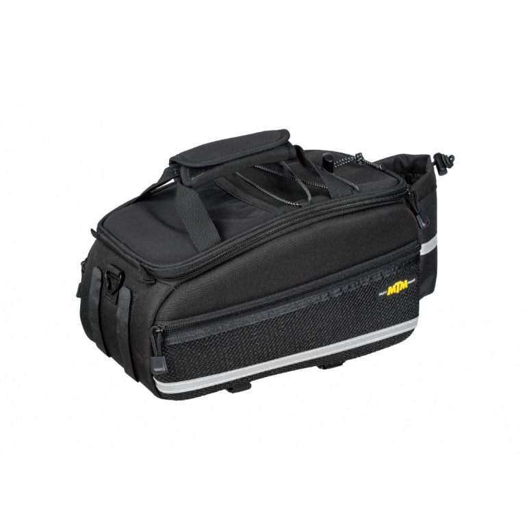 Dual molded side panels combine with flexible 600 denier fabric to form a semi rigid, weather resistant trunkbag. Features a divided main compartment with mesh side compartments and rear water bottle holder. Attaches with integrated straps.