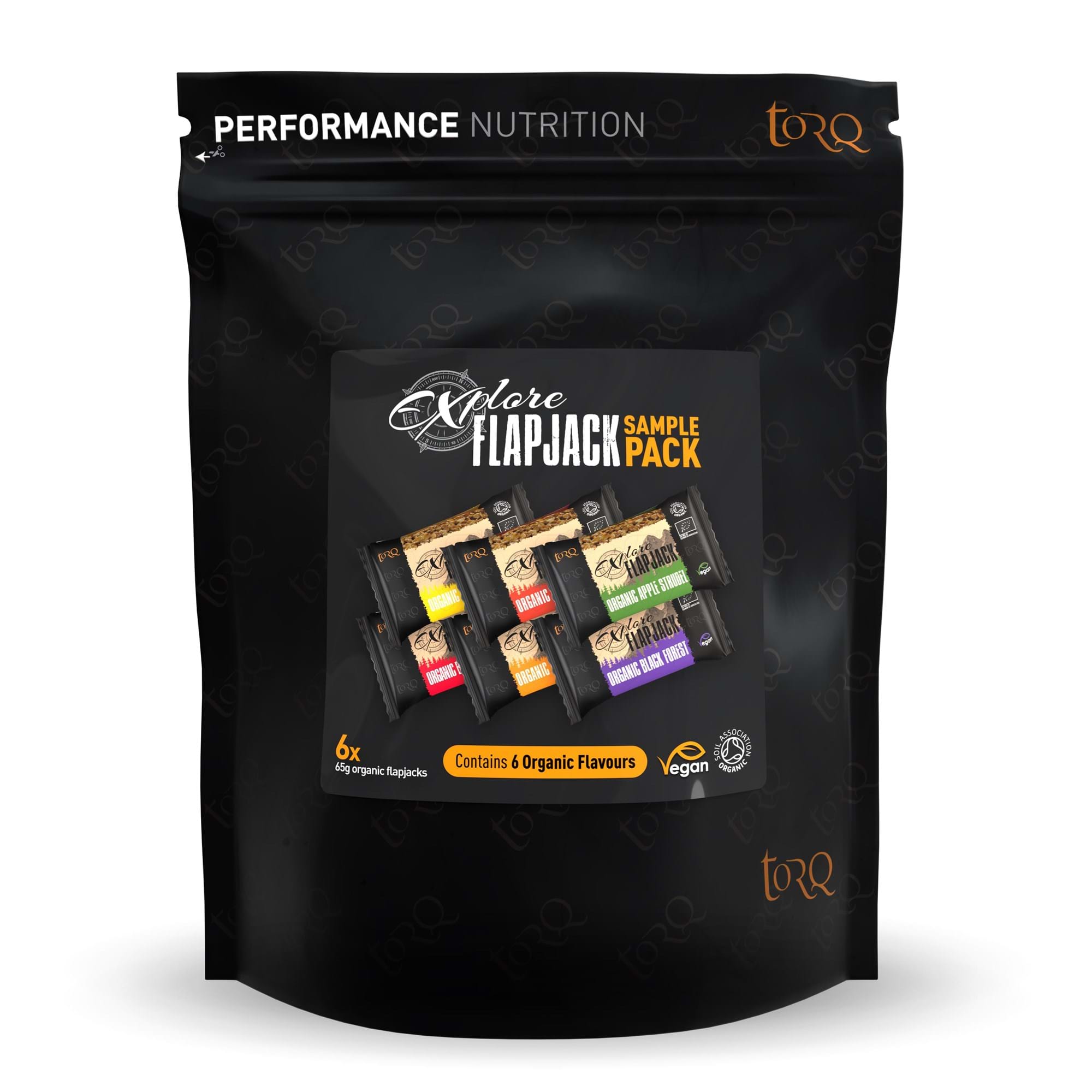 6 TORQ Explore organic flapjacks: Apple Strudel, Bakewell Slice, Banana Cake, Carrot Cake, Ginger Cake, Black Forest.