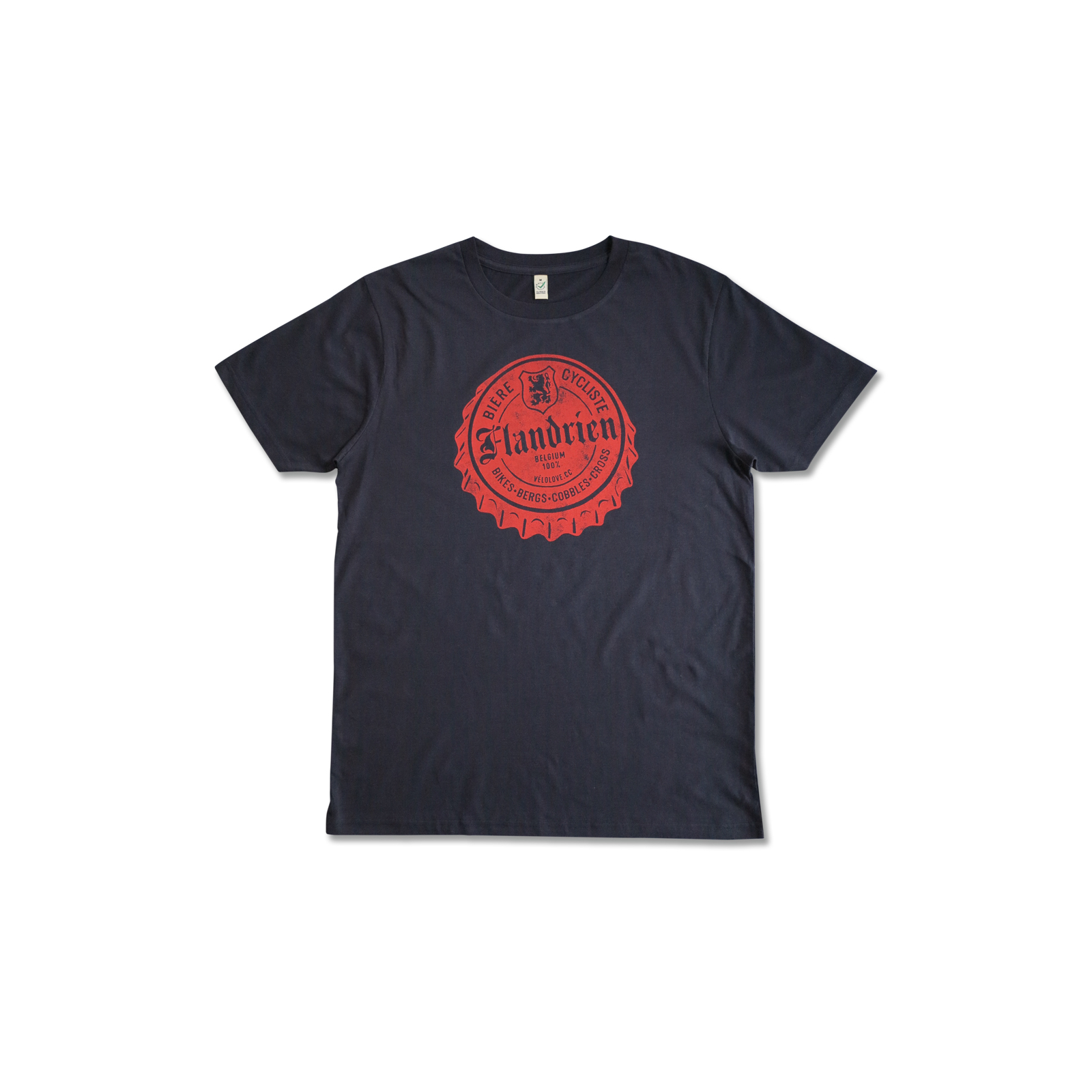 Our New Flandrien Belgian Beer Top is sure to be a hit for the beer and classics loving cyclist. Screen printed distressed effect bottle top in Red onto Organic Cotton Navy T-shirt using Permaset Aqua Soil association approved water based ink.